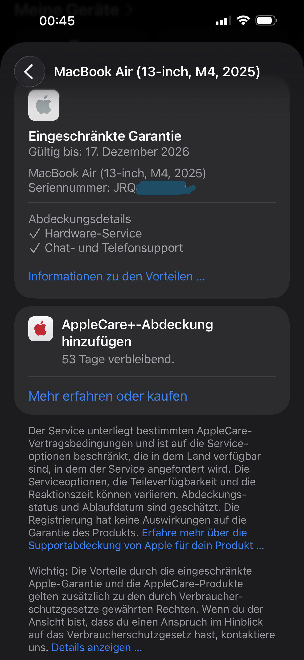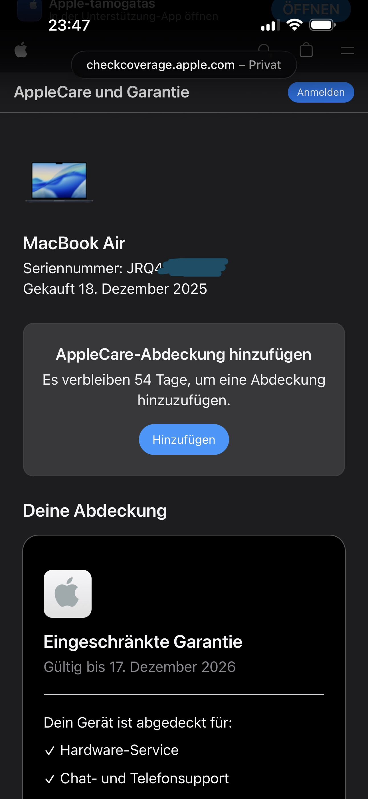Találkozott már valaki olyannal, hogy egy új 60 napon belül vásárolt laptopra se a német se UK sorozatszám ellenőrző oldalon sem ajánlja fel az AppleCare+ vásárlási lehetőséget az adott sorozatszámhoz?