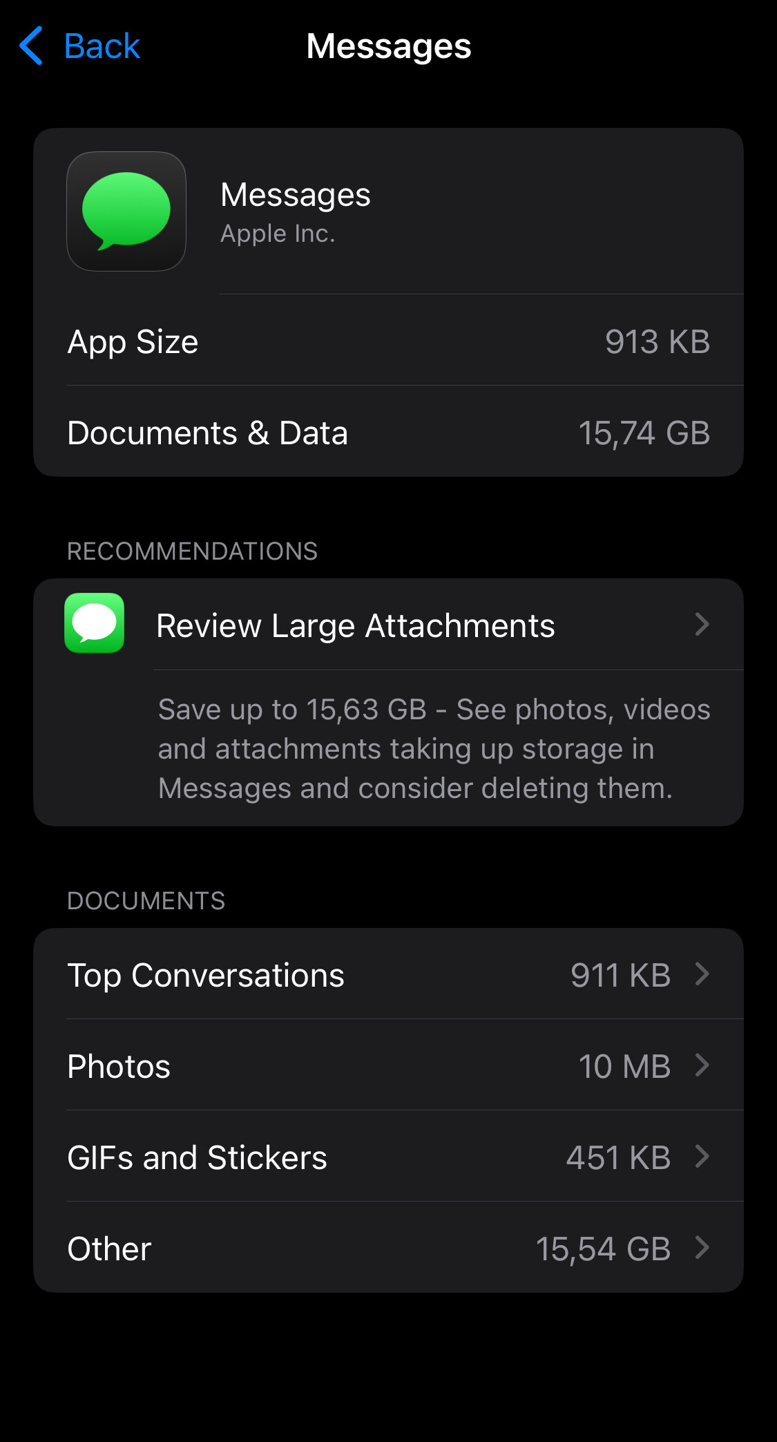 A 15,5 GB közel annyi, mint az iOS és a System Data összesen. Ennyi csatolmányt az életben nem küldtem üzenetben.